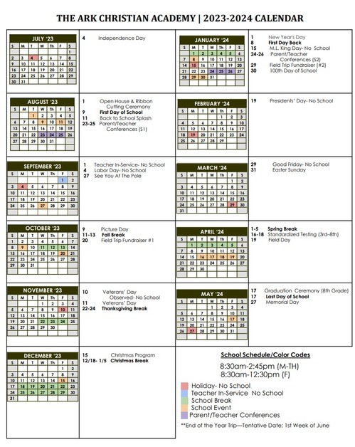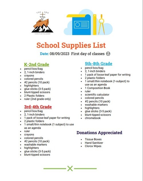 We are excited to kick off the 2023-2024 school year of The Ark Christian Academy. Our vision is to equip the next generation spiritually and academically. We believe that this is the ark God has asked us to create for our children. Open house will take please on 08/01/23 at 6:30 PM. The school will begin on 08/09/23 at 8:30 am. For more information in regards to the school please contact the office at 928-627-3208 Monday to Thursday 8:00 am to 1:00 pm.